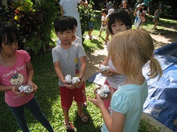 The teachers presented a puppet show on the above mentioned theme to the children before they went egg-hunting in the garden. The experienced children went searching for the big eggs while the new children were satisfied by finding many shiny-wrapped smaller eggs (groundnuts). This year nobody burst into tears because they couldn’t find a big egg. It was probably because some caring children shared their eggs with the smaller ones that everyone was cheerful and happy that morning. I beamed at the children’s joyful faces during their ‘adventure’.