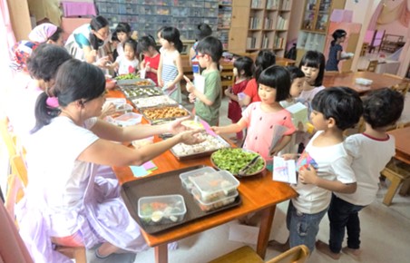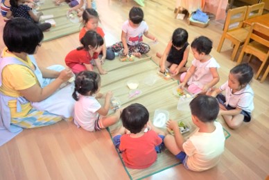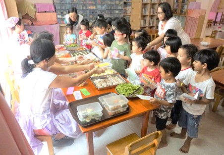 After their morning artistic activity, children eagerly start their creative play. Some are busy making cakes in the kitchen corner in preparation for their friend’s “birthday party”. Some build high towers with blocks. Meanwhile, the other children build their house using dividers and cloth. To make their house stronger, they tie the dividers together using strings. It is heart warming to watch the children take care of their baby doll with so much gentle care. A “mother” changes her baby, pat the baby to sleep in a comfortable bed, and then hangs out the “laundry”.