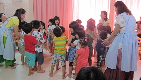 と歌い、幸せの花(折り紙)を子供たちがもらって、おしまい。
