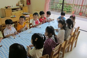 The children started the day by gathering in the dining area to make moon-cakes. First, they rolled lotus paste into 2 round balls. Then they flattened the outside skin layer with their hand and then placed the paste in its middle. Then the skin was wrapped round the paste and the mixture is rolled into a ball again. Lastly they placed the rounded mixture into a moon-cake mould and pressed it. We then keep the moon-cakes in the fridge and they have turn out beautifully by afternoon.