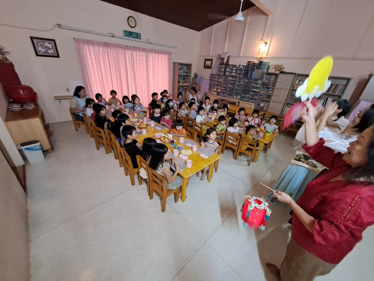 During our snack time, we gathered both classes in the dining hall. We teachers enacted a simple play by acting out the meaning behind this celebration i.e. the roundness of the moon symbolizes the unity of a family where everyone gathers happily together to eat the delicious mooncakes and to drink tea. We ended the play with a mooncake festival song and enjoyed eating the homemade mooncakes with the children. These mooncakes had been made a day before by the teachers and kept in the fridge to set.