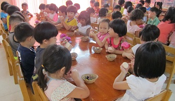 After the puppet show, the children gathered at the dining hall to colour their eggs. While waiting, we sang the catchy song of “Rabbit Hoppa! Hoosh!.” Did they hum the catchy tunes at home?