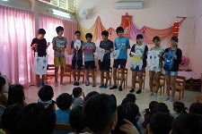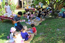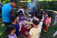 On the following week, 9 students from Penang Japanese School visited us. They made kites from recycle plastic bags to play with the children during our outside playtime. We had picnic with the big “Koko” and “Jiejie” in the garden. Children were happy to play with those energetic teenagers.