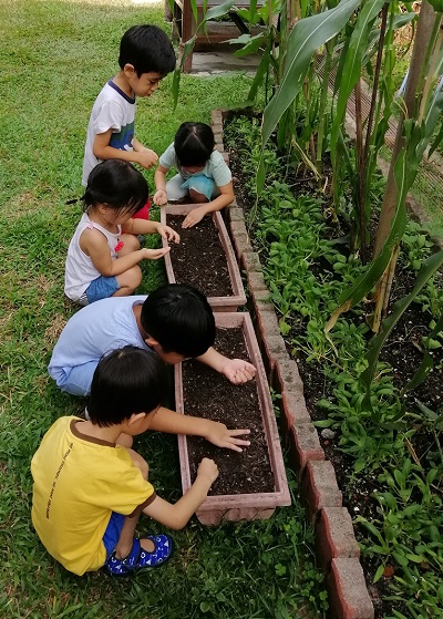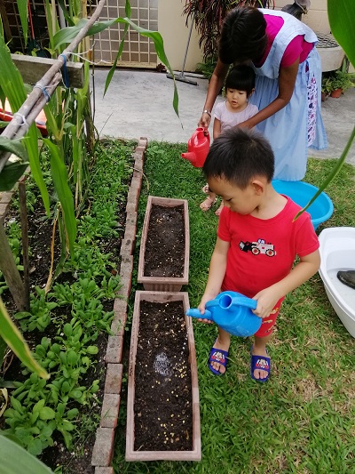 After morning snack, we have outside play time. Most of the children like to play in the sandpit while some of them turn the leaves and flowers into dyes. Some children use the fully bloomed flowers to make flower rings and necklaces. The boys who love to play ‘running and catching’ in the garden have learned to set rules and negotiate terms. Every day, the sound of happy laughter rings throughout the garden. We love to see the happiness in their faces when they run and laugh out loud in the garden.