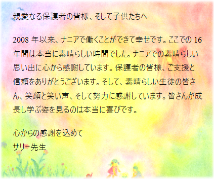 悲しいお知らせなのですが、ナニアを16年勤務されたサリー先生が