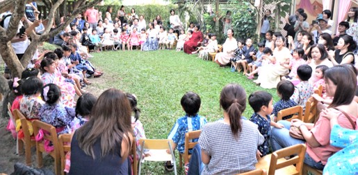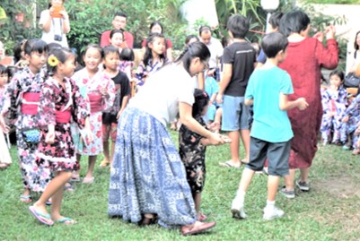 They made dango, a Japanese desert that was served as a snack during our festival. I hope you enjoyed it. After lunch, the children helped to tie plastic bags on the chair legs to protect them from damage. When we saw some dark clouds appearing in the sky, children started to sing “Rain, rain, go away, come again another day……” and we prayed for good weather in the evening. Our wish came true because the weather was wonderful.