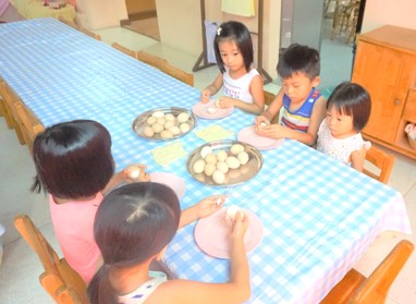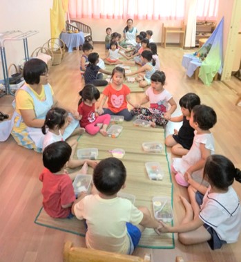 After their morning artistic activity, children eagerly start their creative play. Some are busy making cakes in the kitchen corner in preparation for their friend’s “birthday party”. Some build high towers with blocks. Meanwhile, the other children build their house using dividers and cloth. To make their house stronger, they tie the dividers together using strings. It is heart warming to watch the children take care of their baby doll with so much gentle care. A “mother” changes her baby, pat the baby to sleep in a comfortable bed, and then hangs out the “laundry”.