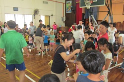 そして、何と言っても一番会を盛り上げて下さったのは、汗びっしょりになって子供達のためにゲームに参加して下さったお父様方です。子供達の手遊び「マジックボックス」から出てきた動物さん達、カエル、ゴジラ、馬さんになったり、風船ゲーム、ボールゲーム、ハイジャンプ、じゃんけん電車など、休む間もなく大活躍され、本当にありがとうございました。(何人かのお母様方も、お父様方の代わりに頑張られていましたね!!)