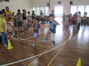子供たちは、歌や詩、踊り、年長さんの組体操、また、ゲームの練習などをしながら、「あと○回寝たら運動会」と指折り数えて楽しみに待っていました。並び方やゴム跳びのやり方、回り方など繰り返して練習しておいたので、上手にできましたね。ただ見知らぬ場所、大きい体育館、大勢の人などに圧倒されて、初めの発表の時など、参加しにくかった子供達もいました。無理もないことです。でも、ゲームなどお父さんと一緒に頑張ってできて嬉しく思いました。