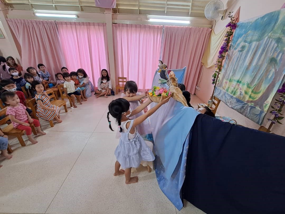 Some big children presented a puppet show during waiting time. They sang the Harvest festival song in the end. Teachers were invited to watch. The children did everything by themselves.